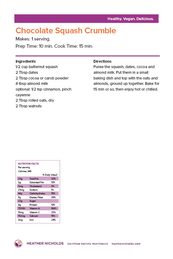 What if I told you that enjoying chocolate in its purest form—as cocoa—is going to give you all the wonderful benefits of chocolate (antioxidants, minerals), plus the vitamins and minerals that make squash so nourishing – all while satisfying your chocolate-tooth? (Is that a word? I think it should be!)