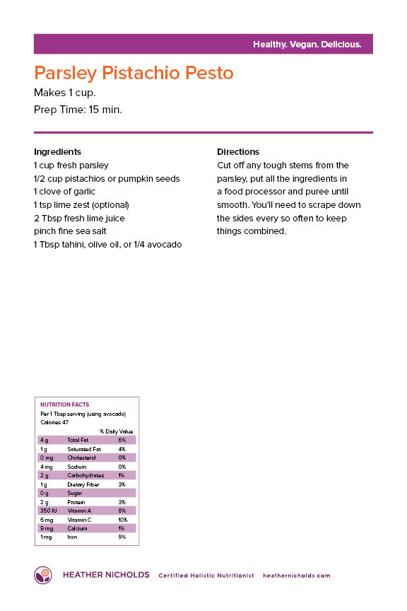 Or, if you prefer, this pesto is scrumptious without any oil at all, using wonderful whole food fats from the pistachios and either tahini or avocado.